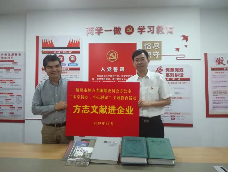 10月15日,柳州市地方志办公室将一批蕴含着厚重历史的柳州方志文献送到柳州金融集团,以“方志文献走出书库”系列活动作为办党组“不忘初心、牢记使命”主题教育的整改措施之一,推动主题教育走深走实。