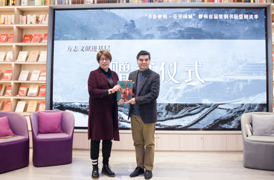 在《尧告》阅读分享会上,作者蒋建雄分享了《尧告》一书的创作经历,市地方志办主任罗方贵讲述了本办参与《尧告》一书编辑的过程,并向与会者介绍了近年来市地方志办编辑、整理、出版地方志书和地情资料书的情况。随后,罗主任代表市地方志办向紫荆花书院赠送《柳州市志》《柳州年鉴》《石头记》等书籍一批。作者蒋建雄也将自己的纪实摄影著作《摩托故事》《百味人生》等赠送给紫?;ㄊ樵骸?/span>